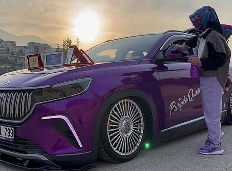 Son olarak yeni aldığı otomobilini de kahverengiden mora dönüştüren Firdevs Çakar, otomobilinin sadece dış kaplamasını değil; içini de mor renkli aksesuarlarla donattı.